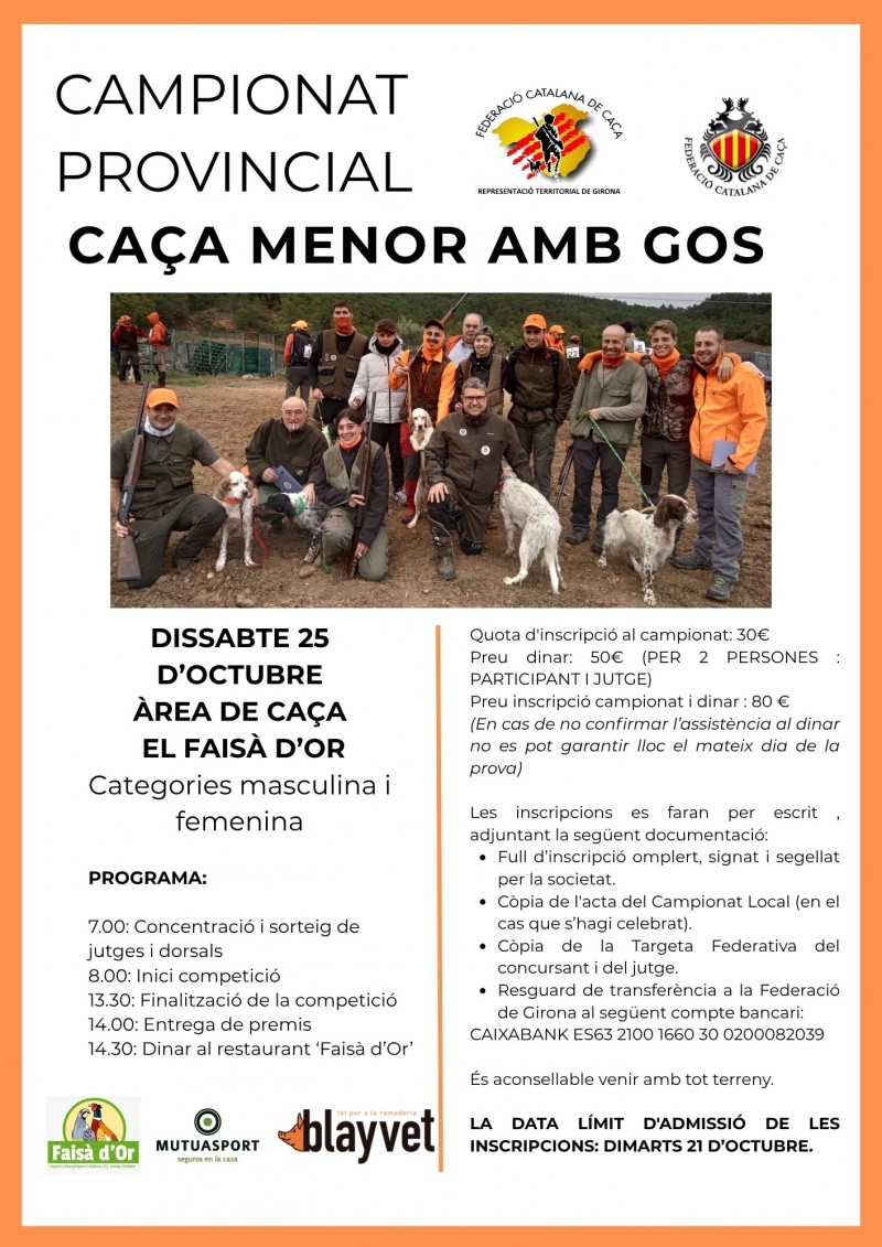 El dissabte 25 d'octubre se celebra el campionat provincial gironí de caça menor amb gos, organitzat per la Territorial de Girona i la Federació Catalana de Caça. Es faràndula a l'àrea de caça d''El Faisà d'Or' i hi hauran categoríes masculina i femenina. En aquest campionat les societats federades podran inscriure un representant masculí i femení.