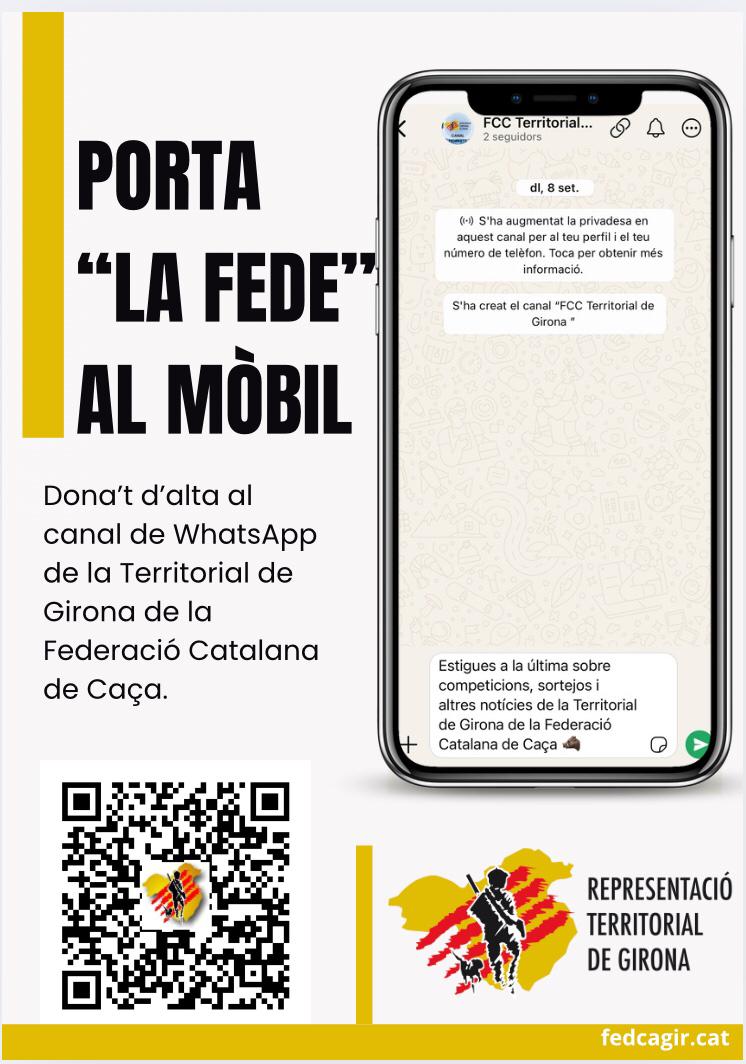 Ens fa molta il·lusió anunciar-vos que la Territorial de Girona posa en marxa un canal oficial de WhatsApp destinat a tots els caçadors federats de les comarques gironines.