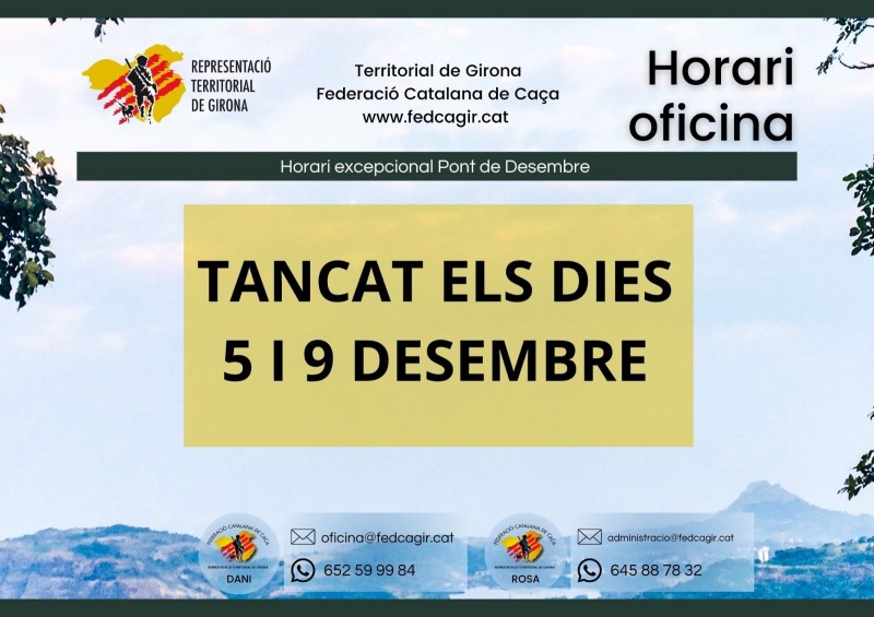 Us informem que les oficines de la Territorial de Girona de la Federació Catalana de Caça romandran tancades els dies 5 i 9 de desembre. Aquests dos dies no hi haurà atenció al públic i, en cas de necessitat, us emplacem a preveure possibles gestions que hagueu de fer abans o després d'aquestes festes. Us recordem que, com cada Nadal, l'oficina tancarà.