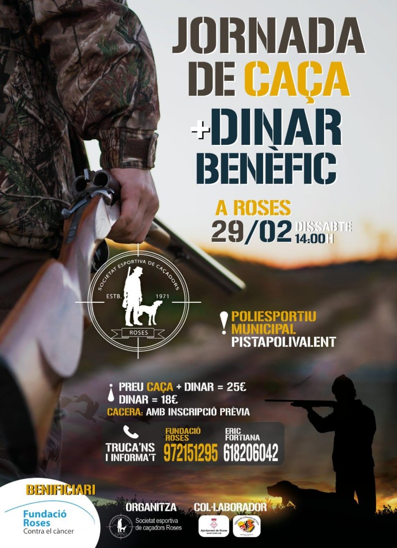 Per quart any consecutiu, els caçadors i caçadores gironins tornaran a mostrar la seva cara més solidària amb motiu de l’organització d’una nova jornada de caça solidària que tindrà per objectiu recaptar fons en benefici d’una causa social; en aquesta ocasió per la Fundació Roses contra el càncer. L'activitat es durà a terme el dissabte 29 de febrer